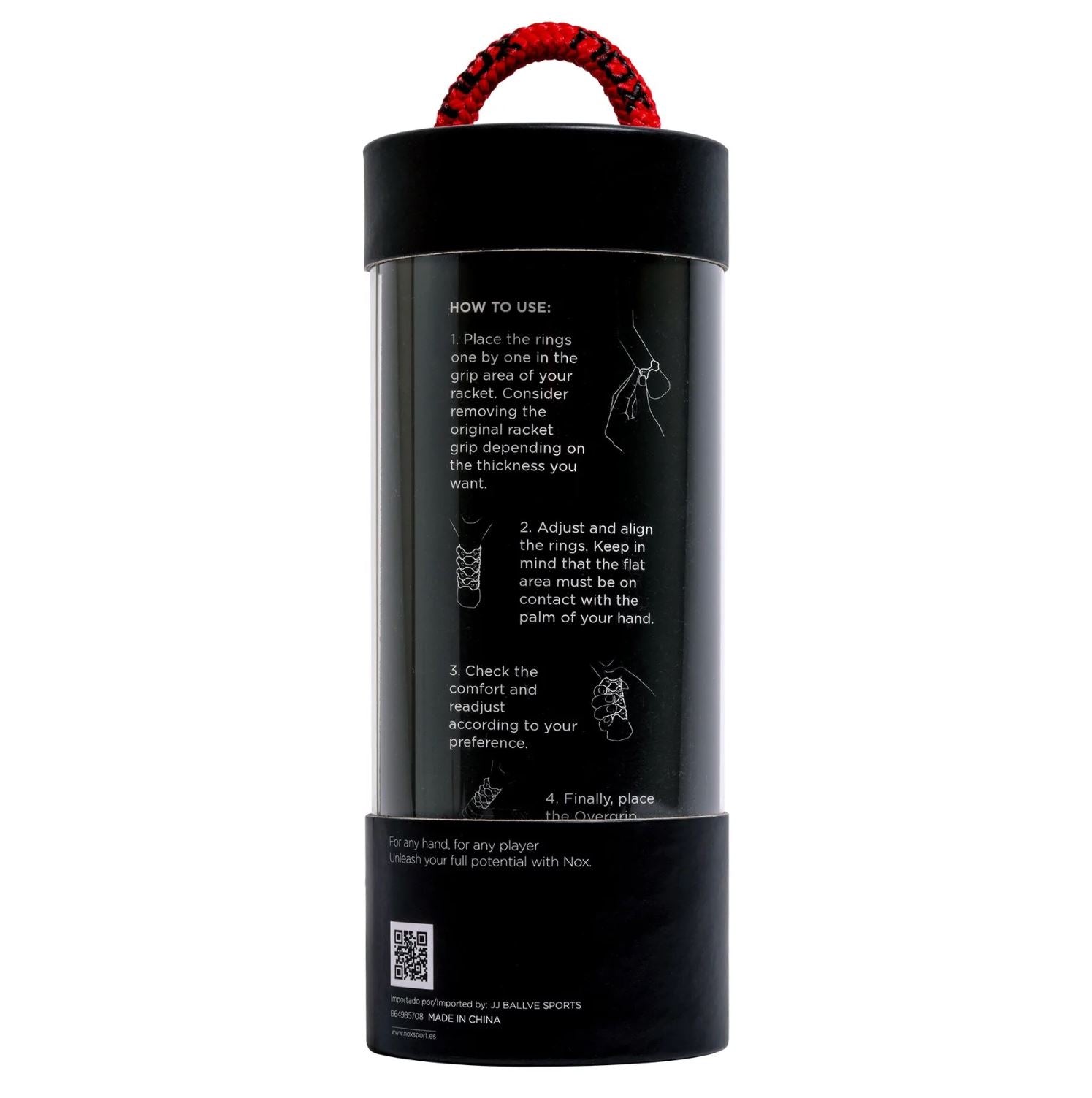 Het product bestaat uit 4 kleine rubberen ringen die je over de steel van het racket trekt. Nox Custom Grip verschilt van soortgelijke producten op de markt doordat je de positie van elke rubberen ring kunt aanpassen, zodat de afstand tussen de ringen perfect kan worden gepositioneerd op basis van de vorm van je hand en vingers.